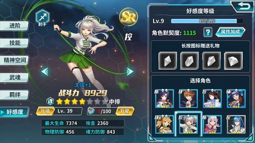 3、在角色界面点击好感度就可以看到好感度等级和属性加成啦,界面下方有一个选择角色栏,它可以让我们方便地对照已有角色的好感度水晶种类和等级。那么好感度是如何加成人物属性的,每级好感度等级升级又需要多少经验呢,我用小号做实验总结出了规律,以前7级举例如下: