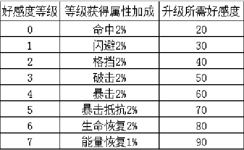4、当好感度达到8级,又会获得+命中2%的加成,属性加成将如此循环下去。而升级需要的好感度,则会按照一个简单的规律递增,相信大家已经发现啦,那就是升级所需经验=当前好感度等级*10+20。