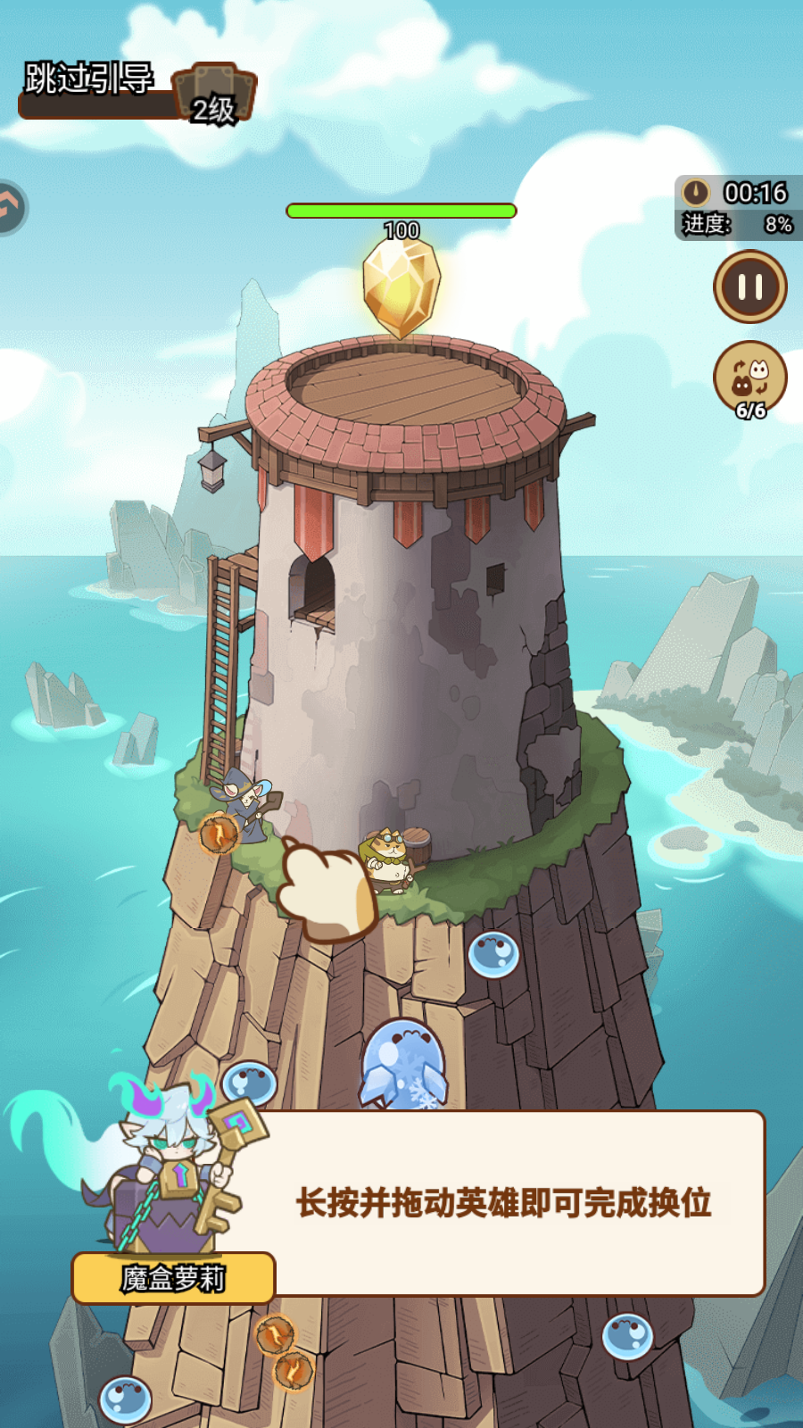 1、进入关卡后,拖动猫咪英雄至战场任意位置即可部署作战。成功消灭敌人将获得经验值,用于升级英雄。