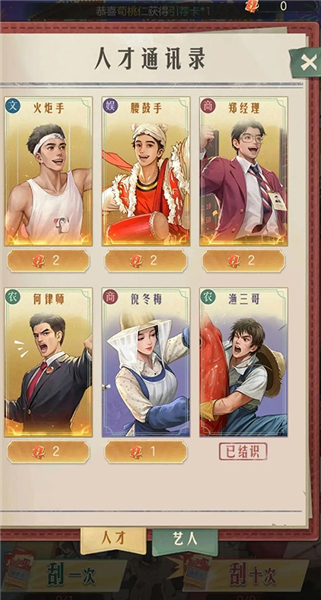 3、开局刮刮乐会赠送一张引荐卡,人才引荐卡很重要,一定要留着两张再进行兑换,主要前期兑换紫色性价比很低。而第二张人才引荐卡可以通过抽取或者引荐卡碎片合成,第一次兑换推荐郑经理”,可以增加两次广场斗鸡活动次数,性价比高。
