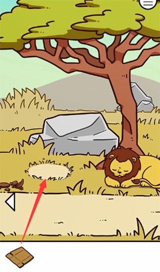 第三关:在第二个场景打碎罐子获得纸箱,回到第一个场景将纸箱放置于圆形空地。狮子会钻入箱中,露出其身下的食物,拾取后即可通关。