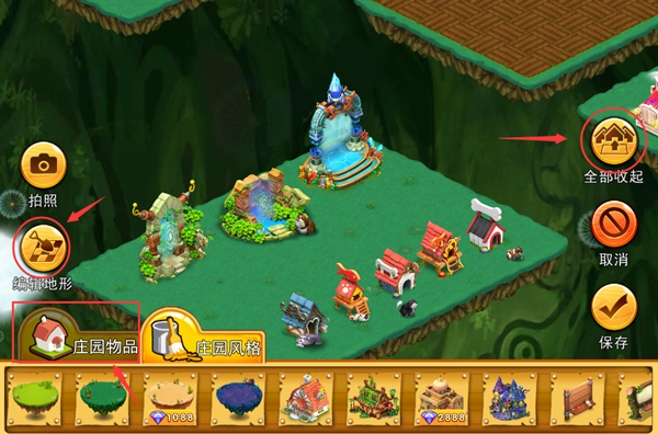3.【全部收起】按钮能把庄园内可以移动摆放的东西全部暂时收到【庄园物品】栏中,方便重新摆放。