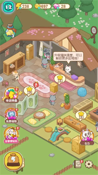 随着业务扩展,你可以使用星星解锁更多浴场区域,并自由布置家具、装饰与功能设施,打造独一无二的猫咪洗浴空间。同时,别忘了应对那些不请自来的干扰角色”——比如突然闯入的猫咪Boss,它们会制造混乱,需要你及时处理以维持正常运营。