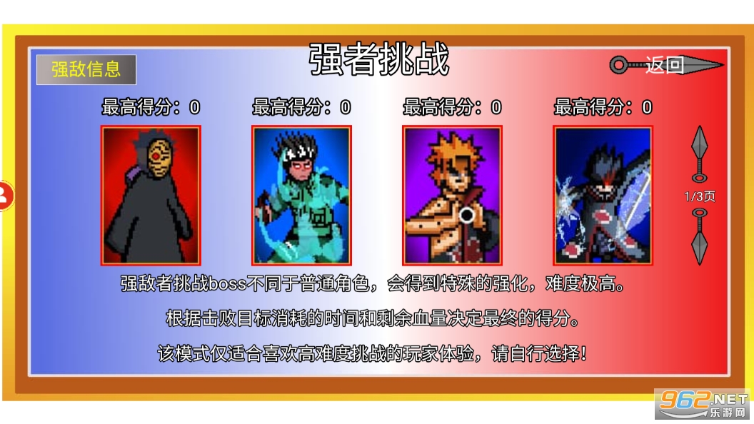 像素火影是一款基于火影忍者系列的像素风格动作游戏。玩家将扮演火影忍者中的角色,在精心设计的像素世界中展开战斗。通过释放忍术、格斗技巧和武器,玩家需冲破关卡,击败敌人并完成任务。游戏采用简单直观的操作方式,加上刺激的战斗场面和多样化的技能,让玩家体验到真实的火影忍者世界。