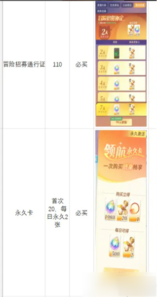 性价比排行:通行证 > 永久卡 > 特惠体力 > 特惠冒险招募 > 终身限购 > 周礼包。