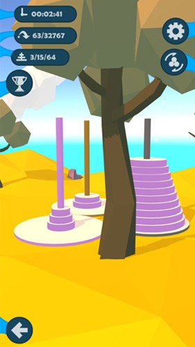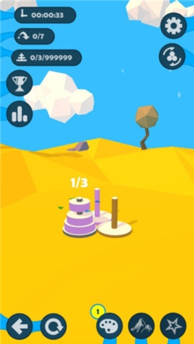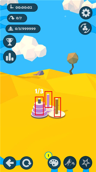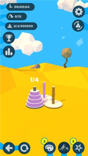 2、进入游戏场景后,你会看到三根柱子以及叠放在其中一根上的三个圆盘。目标是将它们按颜色分类并从小到大放置于对应柱子上以完成挑战。