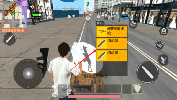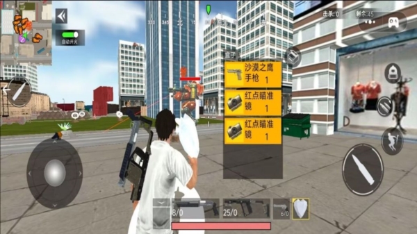 3、跳伞阶段自主选择落点,降落后搜刮建筑物资,获取武器、防具、药品等道具 。