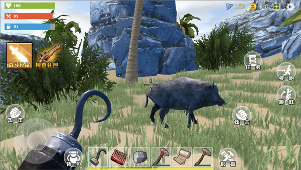 6、玩家在击杀野猪和野鸡的过程中要注意从后面攻击野猪这样容易杀死,如果从正面攻击野猪,玩家容易被野猪杀死,杀死野猪后要及时扩充背包领取杀死野猪的奖励。