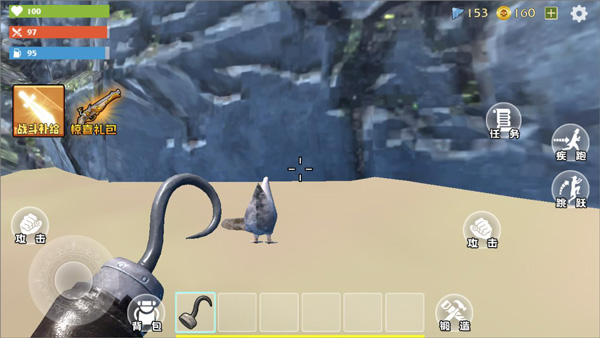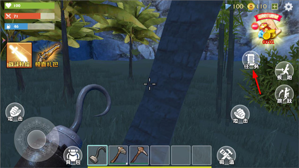 1、玩家进入游戏完成新手引导操作后,可看到游戏操作页面有任务、疾跑、跳跃、攻击、锻造、背包等功能栏,点击任务;