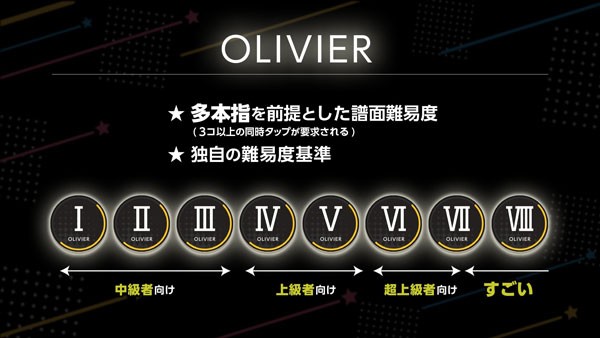 全新高阶难易度「OLIVIER」为追求极致的玩家而设,所有歌曲均配备此隐藏谱面,需使用三指及以上操作。该模式采用独立的星章”评价体系与罗马数字难度标识,虽为额外内容,但不影响主线体验,是高手证明实力的专属舞台。