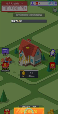 2、房子前期仅有金币收益,达到50级以上才能解锁红包。