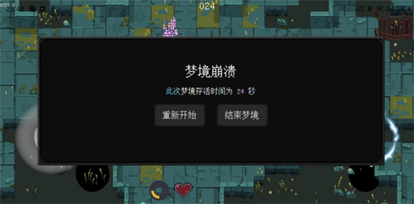 3.若角色生命值清零,会触发梦境崩溃”,可选择重新开始”继续游戏,或结束梦境”退出游戏。