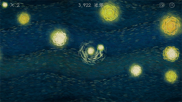 我们相距十万光年官方版是一款融合诗意美学与宇宙哲思的独立休闲手游。游戏以梵高名作《星夜》为视觉灵感,构建出一个星光璀璨、云涡流转的浩瀚宇宙——巨大的星辰在深蓝夜空中闪耀,金黄月牙悬于天际,抽象而梦幻的圆圈”元素赋予整个画面神秘又温柔的氛围。搭配空灵寂寥的钢琴BGM,营造出既致郁又治愈的独特体验,带你踏上一段跨越十万光年的星际旅程。