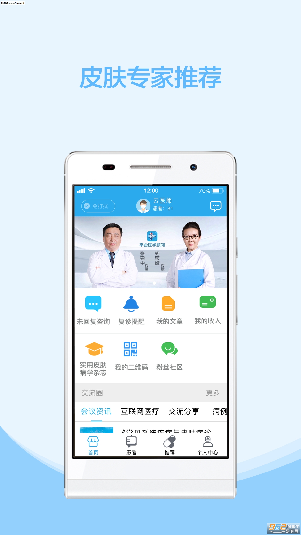 云护肤是为皮肤科医生轻松实现在线复诊咨询服务而量身打造的专用APP。医生可以通过便捷的在线交流模式,轻松实现皮肤病患者的线上线下管理服务,打造皮肤科医生个人品牌。