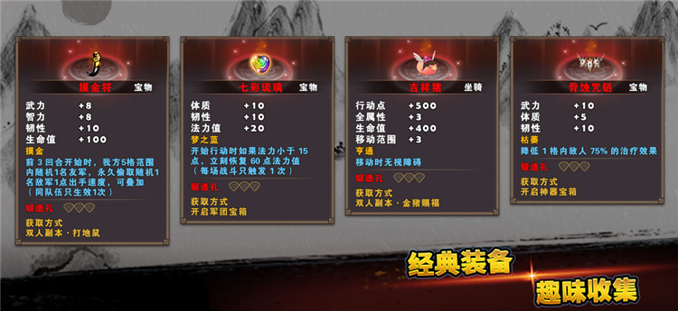 摸金符:技能摸金”——前3回合开始时,5格内随机1名友军永久偷取1名敌军1点出手速度(可叠加,同队限1次)。显著提升先手优势,适用于PVE与PVP。推荐英雄:刘备、曹操、诸葛亮。
