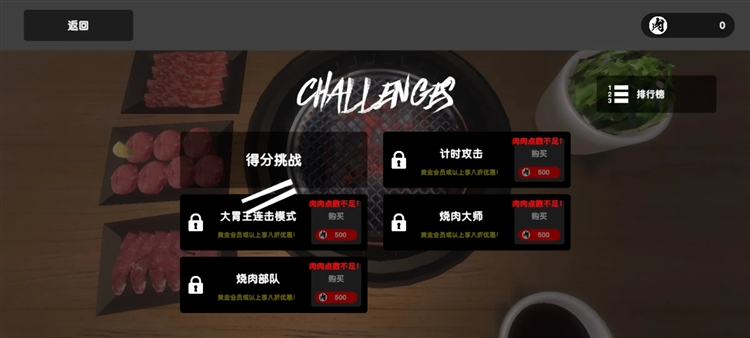 1、进入游戏后点击挑战”,选择适合你的模式开始烤肉之旅。