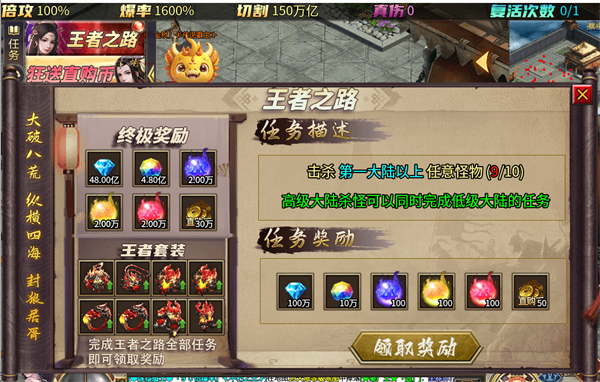 完成王者之路全部任务即可领取奖励,前期我们需要提升的都有对应的NPC围绕每个大陆的安全区,利用我们领到的材料全部升满即可进入下一大陆 材料不够了怎么办,直接下图打怪 所有提升材料都可以打怪获得!爆率超高!