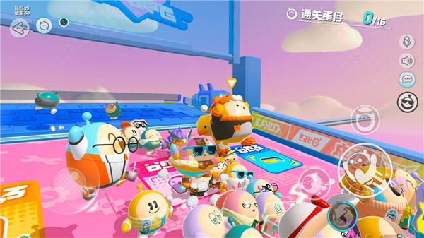 1、游戏操作其实非常简单,左侧摇杆控制方向,右侧包含跳跃、飞扑、道具以及滚蛋”功能按键。这里滚蛋”非常有特色,点击激活便可让蛋仔缩成圆球向前滚动,行进速度非常之快,还可以进行跳跃。建议在障碍物不多的直道时使用,不然不小心碰撞到障碍物的话,还会造成非常大的反弹,拖慢行进速度。