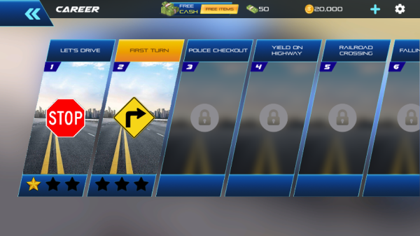 游戏以教学为核心设计理念,引导玩家从基础操作逐步掌握高级驾驶技巧。进入游戏后点击Play”即可开启旅程,随后选择关卡开始训练。每个关卡均融入道路安全知识与实际驾驶规范,例如定点停车任务中,玩家需先完成系安全带、启动引擎、挂挡等标准流程,再在规定区域内精准停靠,全程遵守交通规则方可获得三星评价。这种寓教于乐的方式,让新手也能在趣味中成长为合格驾驶员”。