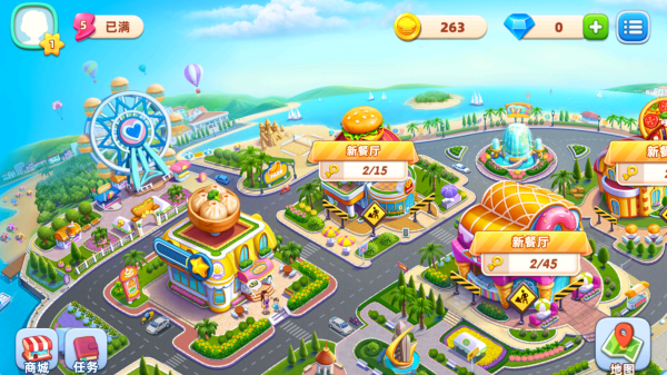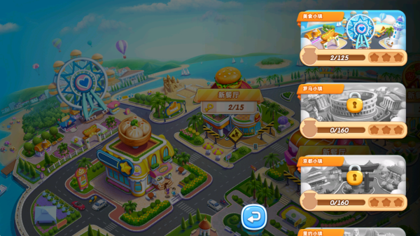 1、在地图场景中,点击你已经解锁的餐厅开始关卡挑战,其他餐厅需要通过收集关卡钥匙进行解锁。