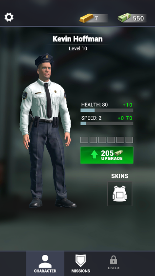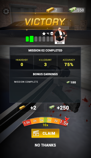 游戏采用直观触控操作,上手简单却极具深度。进入主界面后,轻点任意位置即可开启任务;战斗中,按住屏幕中央的子弹图标并滑动调整准心,松开即完成精准射击。每成功清除所有目标,你将获得钞票与金块奖励,用于在角色界面强化各项基础属性,持续提升战斗力。