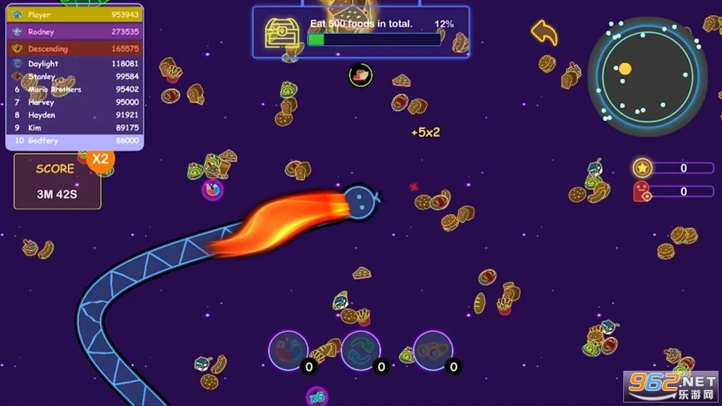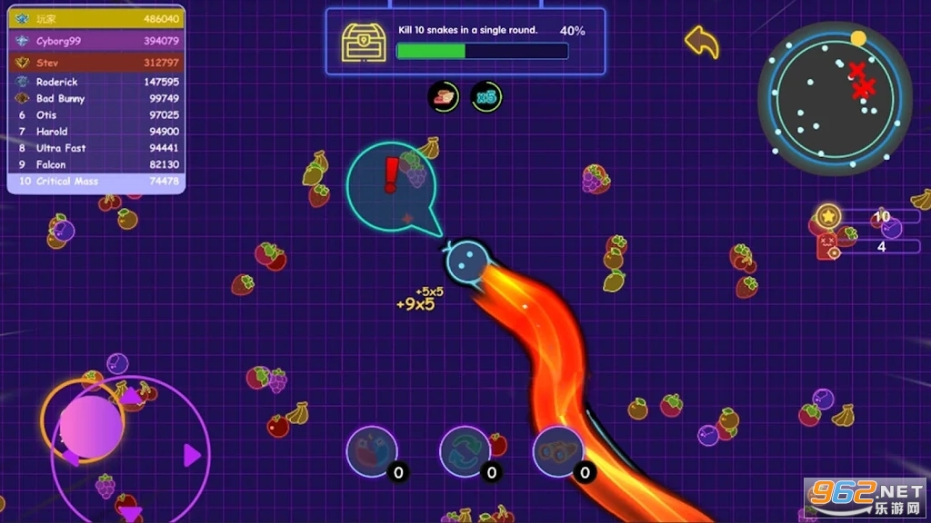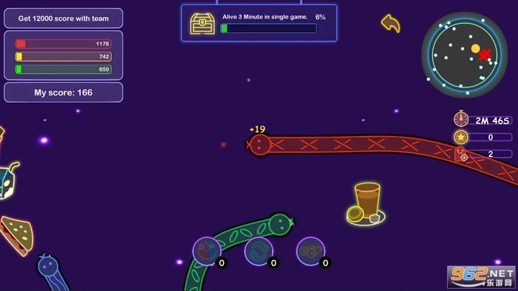 1、霓虹贪吃蛇中通过操控小蛇,吞噬各种能量,也能吞噬掉死去的小蛇;