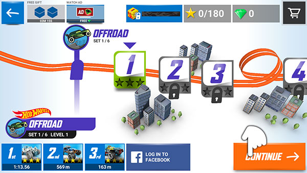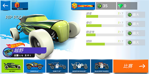 初次进入游戏,建议从已解锁的闯关模式开始体验。点击【CONTINUE】进入关卡后,可选择当前拥有的赛车,并通过右侧界面进行性能强化。准备就绪后,点击【RACE】正式开赛——左侧按钮控制刹车,右侧负责加速。比赛中需保持车身稳定,避免翻车,顺利抵达终点即可根据用时获得星级评价与奖励。