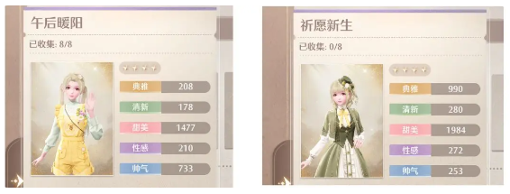 四、【服装焕新】不推荐养任何主线套装,以午后暖阳(主线套装)和祈愿新生(兑换套装)为例子,都是四星套装,但是主线套装的主副属性分数要低35%左右