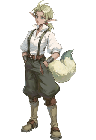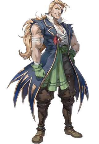 拥有一头鲜艳红发的冒险家青年。与多吉一同在沿海地区旅行时,因被卷入泰拉一行人的事件面登上海盗船,最终决定前往”卡南大旋涡”。出海进入阿特拉斯海一周后,海盗船遭到罗门舰队炮击时,为了保护特拉而从海盗船上跌落,被大旋涡”吞噬。