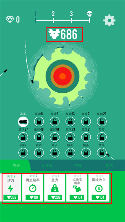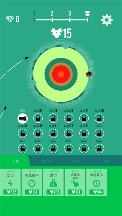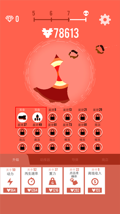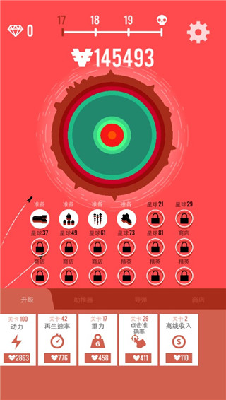 成功摧毁行星可获得金币奖励,这些资源不仅是推进进程的关键,更是强化战斗力的核心。你可以用金币解锁新型飞船与导弹,同时升级飞船的动力、再生速率、重力等关键属性。每一次升级都将显著提升你的机动性、生存能力与轰炸效率,让星际征途越战越强。