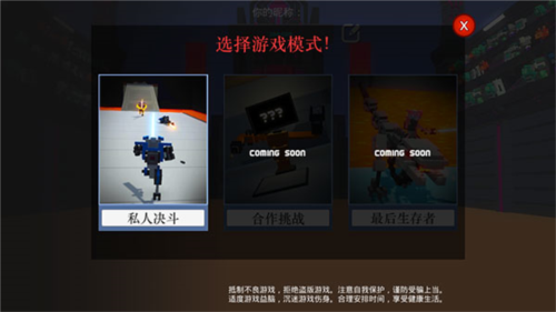 2、然后【选择游戏模式】,目前只开放了私人决斗,合作挑战和最后生存者模式会随未来版本更新而上线。