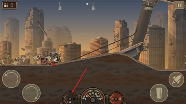 3、进入游戏后,左侧两个按钮分别控制车辆的压头和抬头,右侧则是油门按钮,点击火箭按钮可以使用推进器。