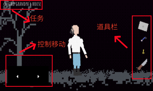 2、进入游戏之后,我们会看到主人公站在漆黑的森林之中。左上方是任务,下方可以控制人物移动,右边是道具。