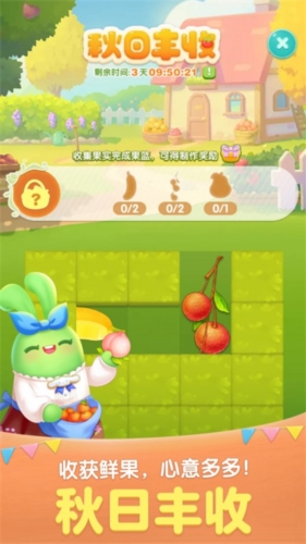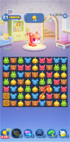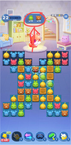 5、在游戏界面,玩家需要注意上方会显示通关的条件,如图的通关条件就是需要消除10个兔子和10个熊,越少的步骤完成关卡任务就会得到越高的分数。