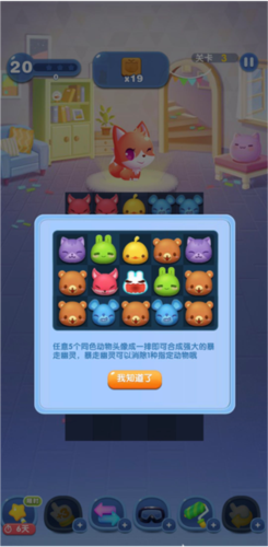 6、在消除的过程中,不能随随便便乱配对,需要小心谨慎,特别是不要错过那些能够凑出特效的步数。当五个同样的动物合成一排的时候会产生一个暴风幽灵,这个幽灵和任意一个头像互换就可以消灭游戏盘中所有的同类图标。