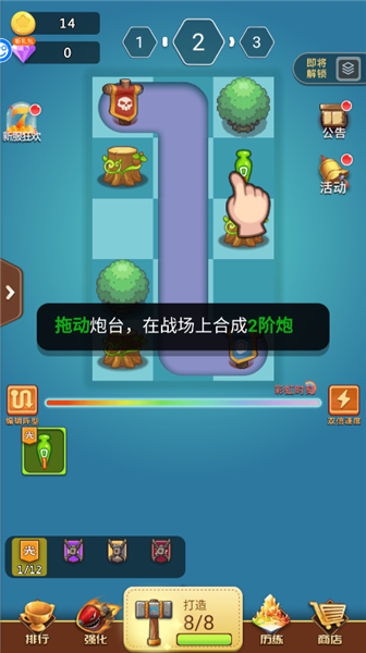 1、拖动炮台,在战场上合成2阶炮,然后攻打怪兽