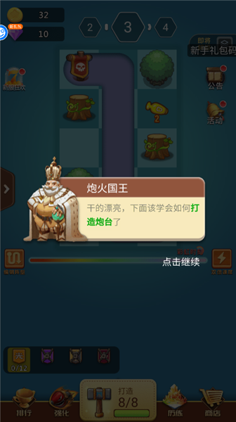 3、干的漂亮,下面该学会如何打造炮台了,点击继续。