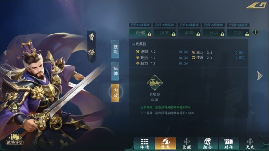 内政技能属于城池内政技能,需要在占领名城后,在城池中展开相应的内政玩法才能产生效果。不过开启内政需要到达一定等级和武将碎片进行解锁,解锁后可以通过符石”进行升级效果。