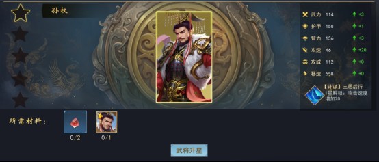 在游戏中,武将升星能提升武技技能和属性,但需要消耗阵营符石和相同武将碎片。武将的星级决定了武将的上限。