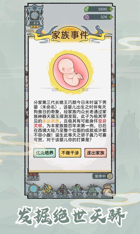 游戏中充满了随机性,家族的发展进程因各种意外事件而变得更加丰富。比如偶遇强大的修仙者,或是家族成员之间的争斗与矛盾,这些事件都会影响家族的命运。