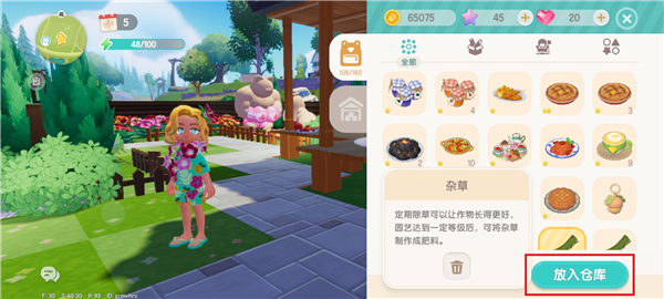当背包满了可以将物品放入仓库,仓库功能只能在家园中使用。选择背包里想要放进仓库的物品,点击放入仓库。