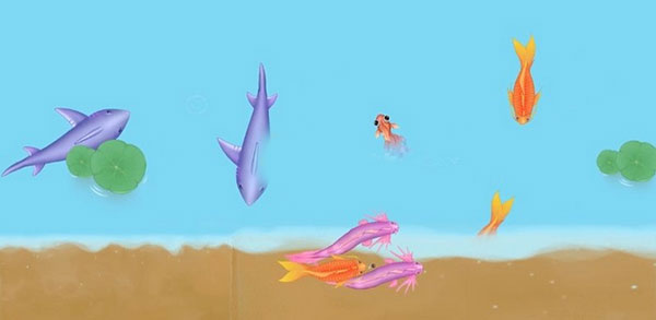 如果是手残党的话,可以考虑一直苟着来通过小蝌蚪到锦鲤的阶段,不要到处乱跑,尽量贴着沙滩游就可以了,贴着沙滩走还有减速的效果。如果可以用大屏、横屏玩,那么难度更是直接减半了。
