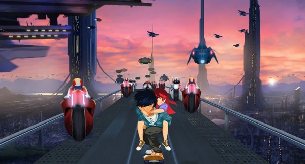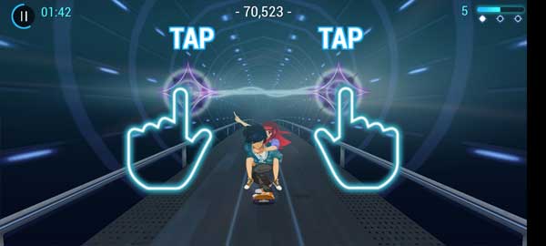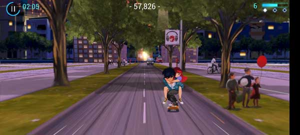 3、游戏开始会是一个男孩背着女孩通过滑板进行跑酷,遇到这种闪光,玩家需要左右滑动来触碰到闪光得分,触碰到越多分数也就越多。