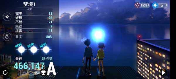 6、音乐跑酷结束之后,玩家就能查看你的分数记录、失误、连击数量等参数,如果想要重新开始点击刷新按钮即可。