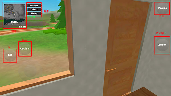 2、我们进入了一个房子里,左边可以控制移动、站坐、行动还有显示地图和状态,右边可以放大缩小视角;