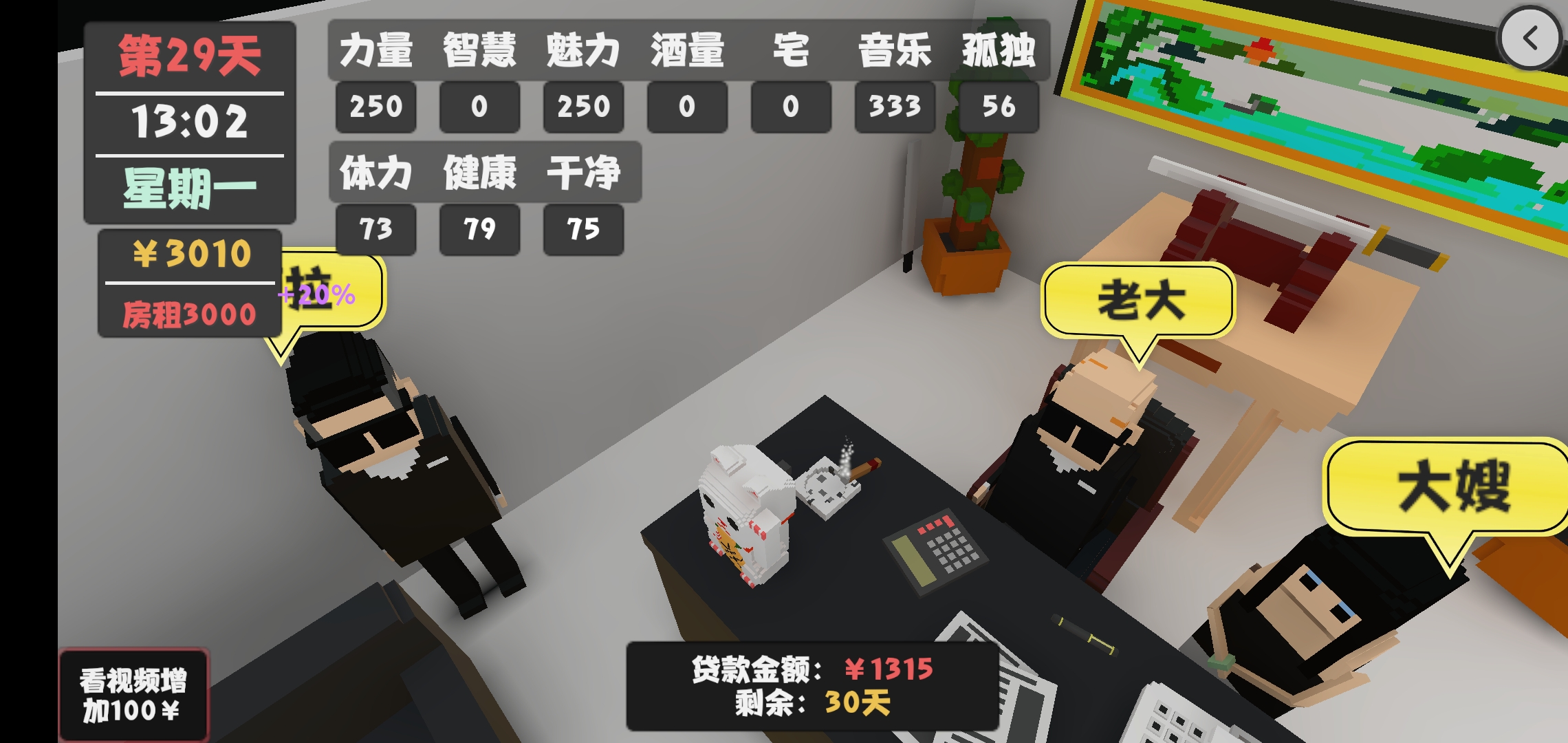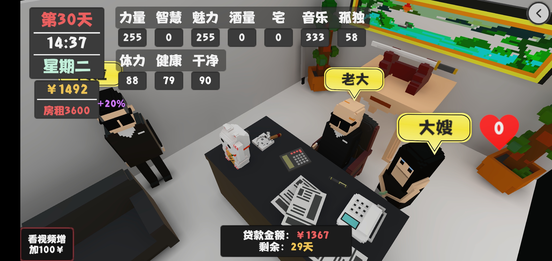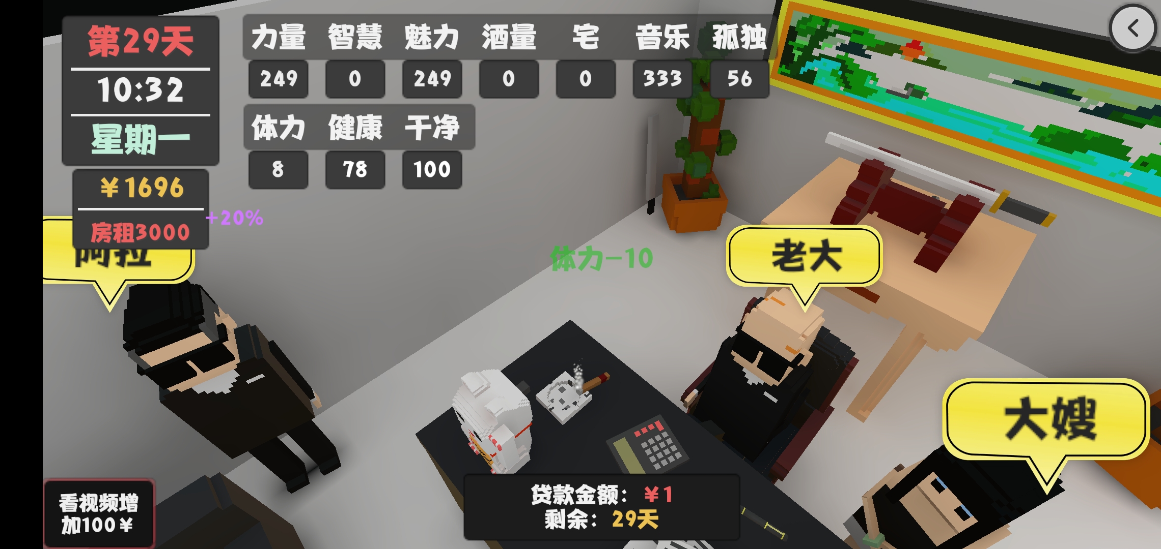 第二个月,仍然是继续刷属性,找女友刷点好感,你可以开始尝试喝酒了,请房东吃饭和房东搞好关系,只要你能保持一周扫一次就能让房东的好感度不掉,让他给你减房租。
