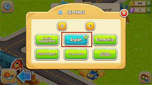游戏默认语言为英文,但支持中文界面。进入游戏后,点击右上角齿轮图标进入设置菜单。