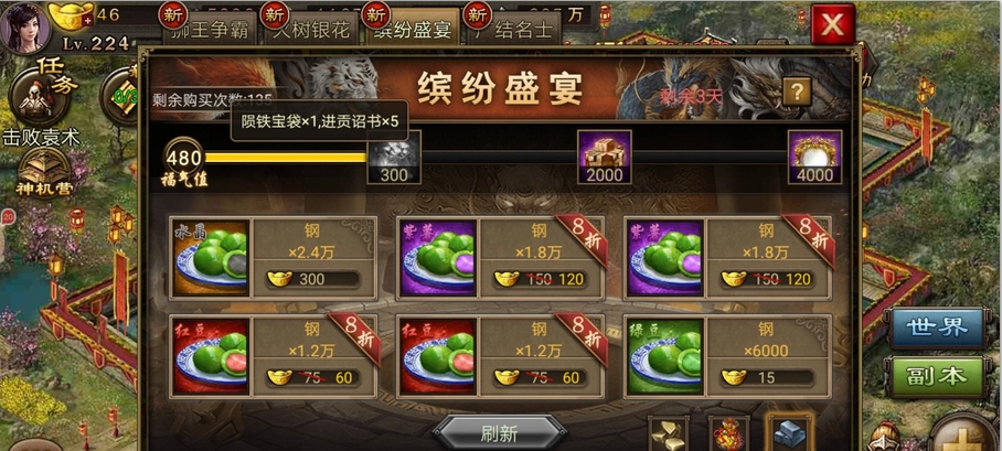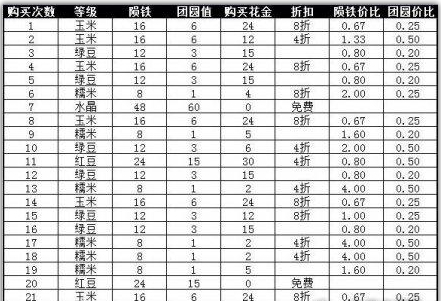 购买选项一共有三种,分别是陨铁 锦囊 百炼钢 每项有六个等级,从低到高分别是糯米 绿豆 玉米 红豆 紫薯 水晶 对应了从低到高的奖励 福气值 以及所花费的金币数量 ;