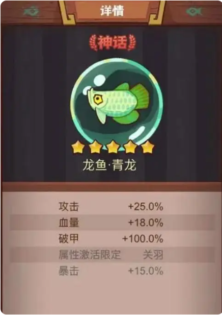 青龙是关羽的专属鱼,附加的属性里面也有破甲词条,与赤羽一样的,但是攻击力加成也是高于赤羽的,属于是赤羽的上位,不过专门去兑换青龙的玩家基本上都是主培养关羽的玩家,而且青龙给关羽佩戴的话还能够增加关羽的15%爆率,当做一条破甲鱼给吕布佩戴就有点太浪费了。