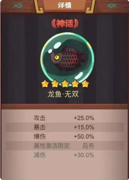 无双是吕布的专属鱼,这条鱼灵所增加的面板非常吓人,三条属性分别是攻击力、爆率、暴伤,属于是输出拉满了。而且专属鱼都有专属的效果,无双给吕布佩戴的时候还能给吕布提供20%的伤害减免,防止吕布为了压血触发心魔而暴毙,能够很有效的解决这个问题,打很多敌人护甲不高的关卡好用。